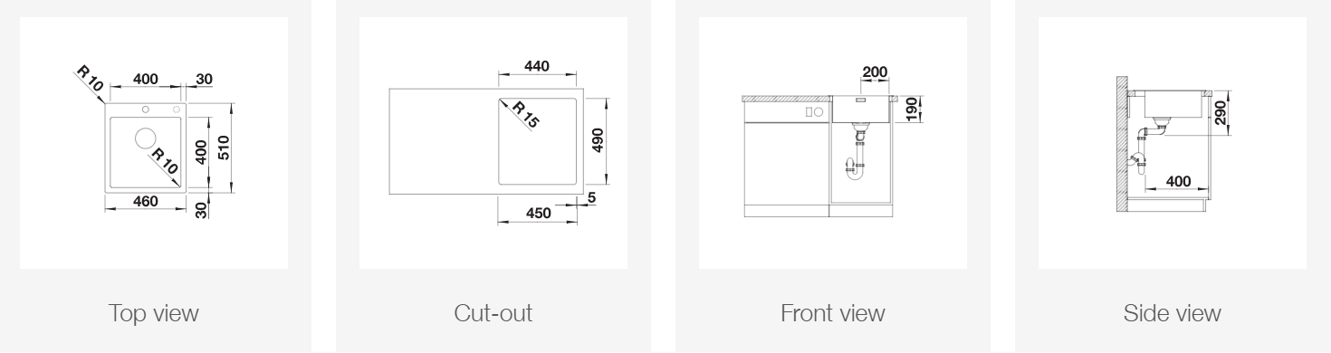 *Учитывать ширину пристенного канта в случае установки мойки возле стены или пенала.