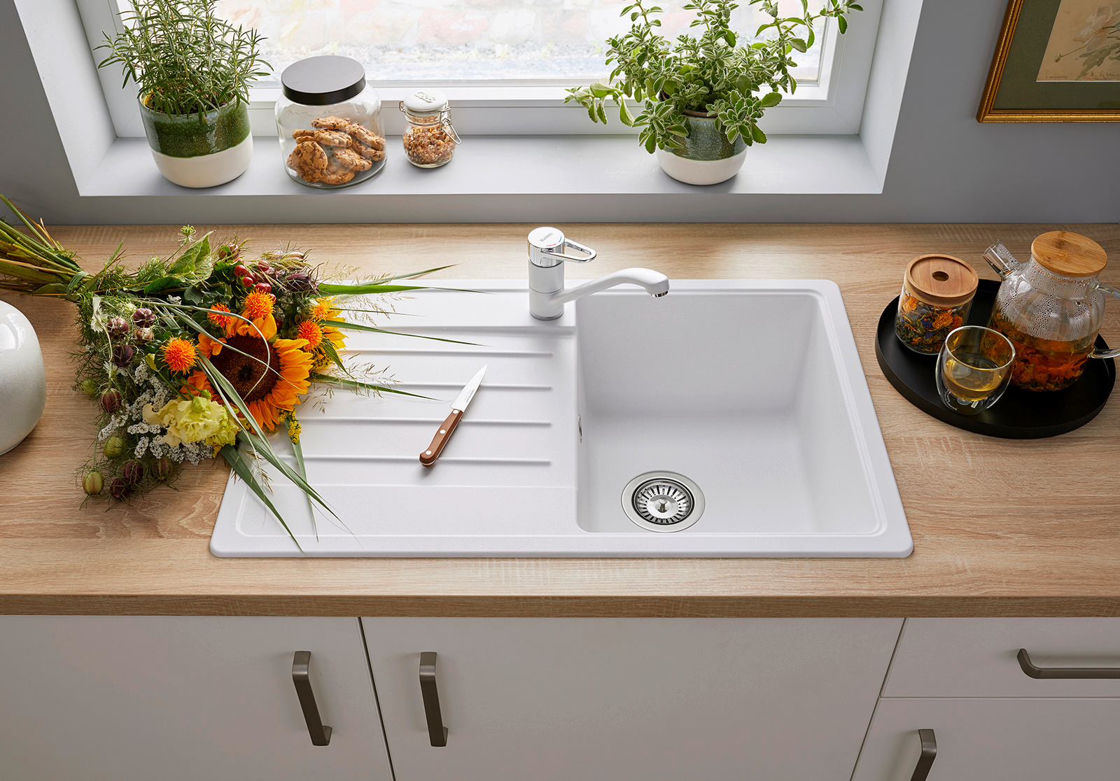 Поверхность экологична и безопасна для продуктов, влагостойка, легко очищается от загрязнений. Материал не выцветает при воздействии прямых солнечных лучей, что позволяет устанавливать мойку перед окном или на солнечной стороне.