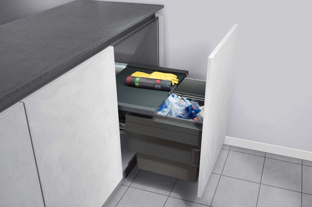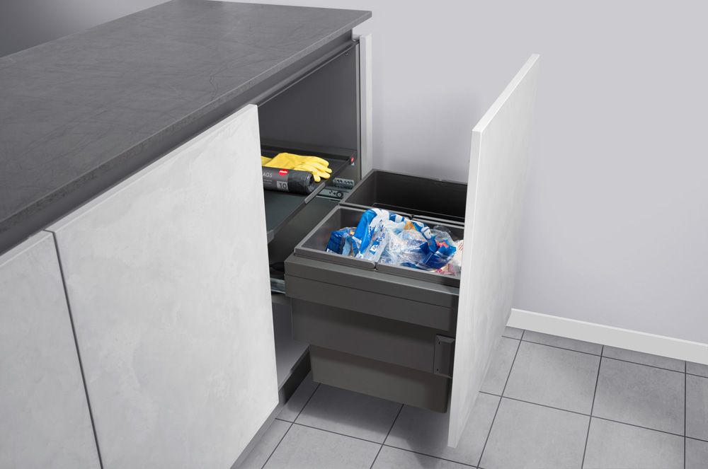 Встраиваемая система сортировки мусора Hailo Cargo Synchro 3608-62 Soft-Control с двумя контейнерами по 28 литров в шкаф под мойку с креплением выдвижного фасада, установка на боковины шкафа.