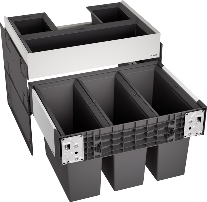 Рама из окрашенной гальванизированной стали с выдвижным механизмом - выдвижная система хранения с тремя съемными контейнерами - 3 пластиковых контейнера на 15 л - крепеж |