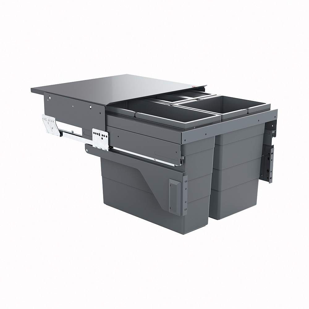 Комплектация: рама, общая стационарная крышка из металла с покрытием, направляющие полного выдвижения с функцией Soft-Control, крепление фасада, 1 ведро 17л, 1 ведро 13л, 1 ведро 13л с плотной крышкой, шаблон для монтажа, крепеж.
