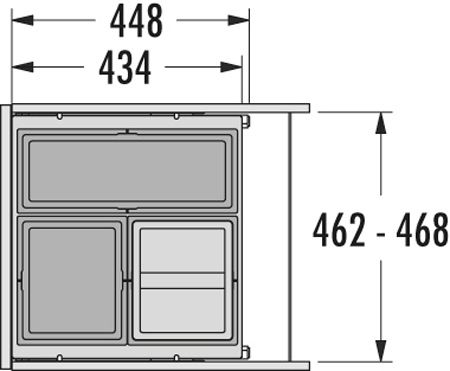 | Комплектация | Рама, общая стационарная крышка, направляющие полного выдвижения, крепление фасада, 1 ведро 17л, 1 ведро 13л, 1 ведро 13л с плотной крышкой |