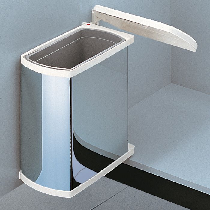 Встраиваемое ведро для мусора 18 литров, плоское со стационарной крышкой, основной корпус из нержавеющей стали, внутреннее ведро 18л из серого пластика, крышка и окантовка из белого пластика и механизм открывания и крепежи из стали, окрашенной в белый цвет.